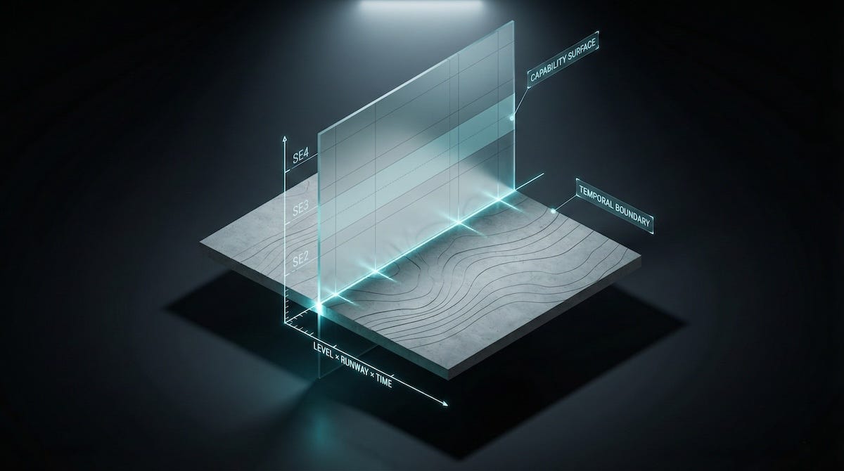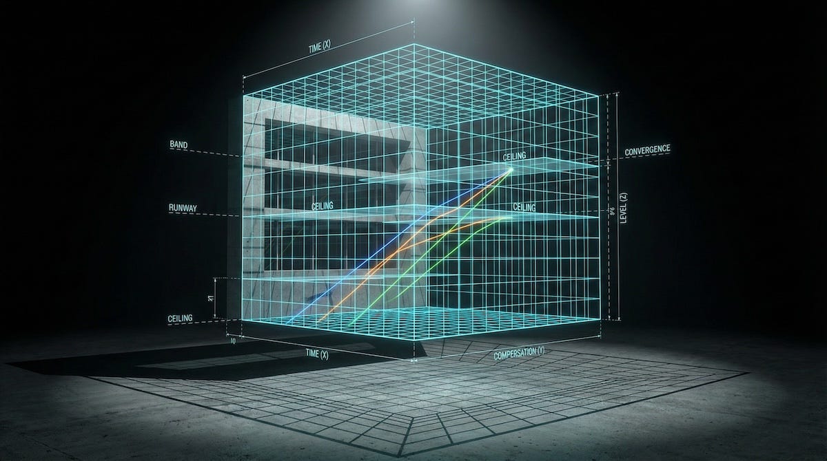 The compensation band defines a bounded space. Floor to ceiling, it represents the full economic range the organization has defined for a given level. Band Compression assumes an engineer enters somewhere in the lower-to-middle portion of that space, giving the annual adjustment vector room to travel before reaching the ceiling. That room is the runway. It is the temporal headroom within which the planning horizon operates. Compress the room and you compress the time. Eliminate the room and you’ve hired someone into an immediate ceiling condition on their first day, before they’ve written a single line of code, before they’ve had a single development conversation, before the model has had any opportunity to function as designed.
