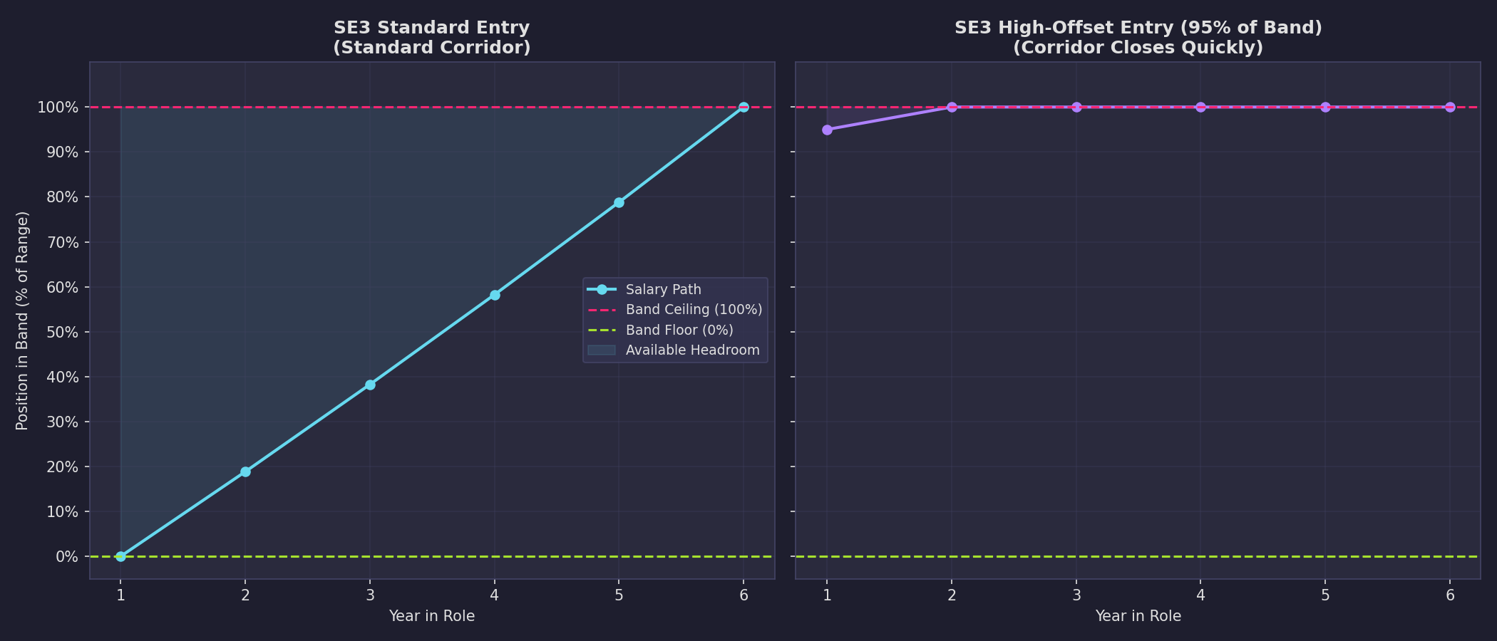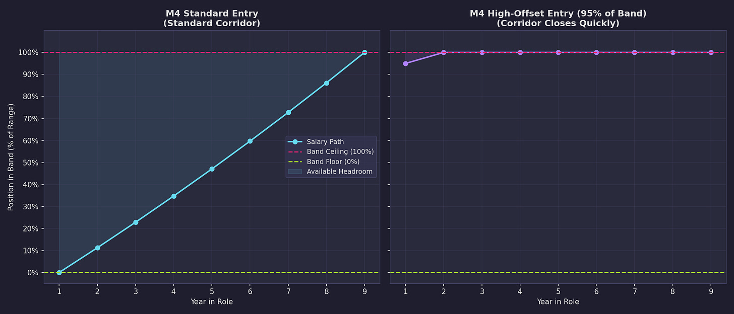 At any given level, the band defines a floor and a ceiling. An engineer enters the band, either through hiring or promotion, at some point between floor and ceiling. Each annual adjustment moves them closer to the ceiling. The number of years before they reach that ceiling, the band runway, is determined entirely by their entry point and the ceiling’s position. This number is knowable from day one. It is not a mystery. It is basic arithmetic.