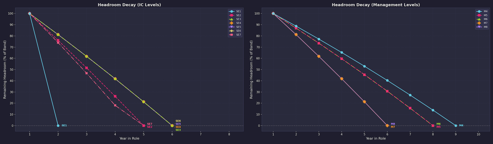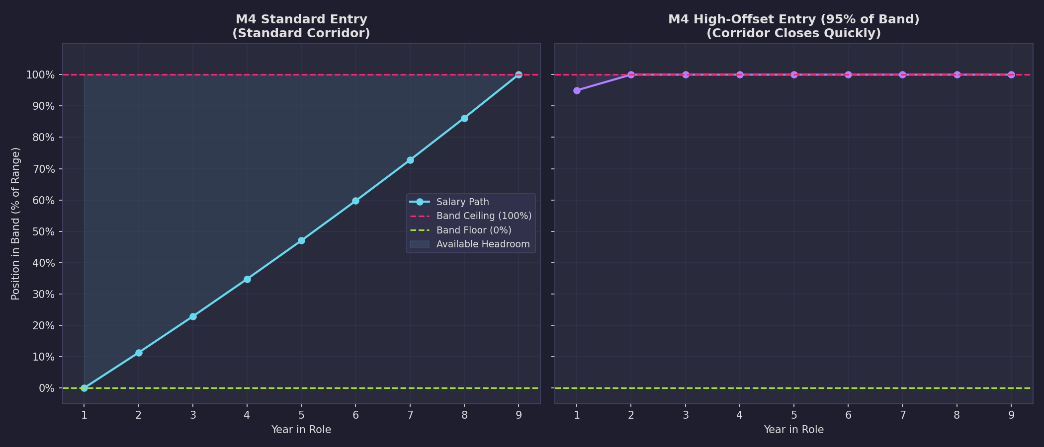 The headroom curves for both IC and management tracks illustrate this directly. Every level begins at 100% headroom and descends toward 0%, with the slope determined by band width and entry point. The VP (M8) reaches the boundary faster than the Engineering Manager (M4), an implicit structural assertion that executive-level compensation converges sooner because the bands are narrower relative to the adjustment rate, and the organizational cost of unplanned convergence at senior levels is correspondingly higher.