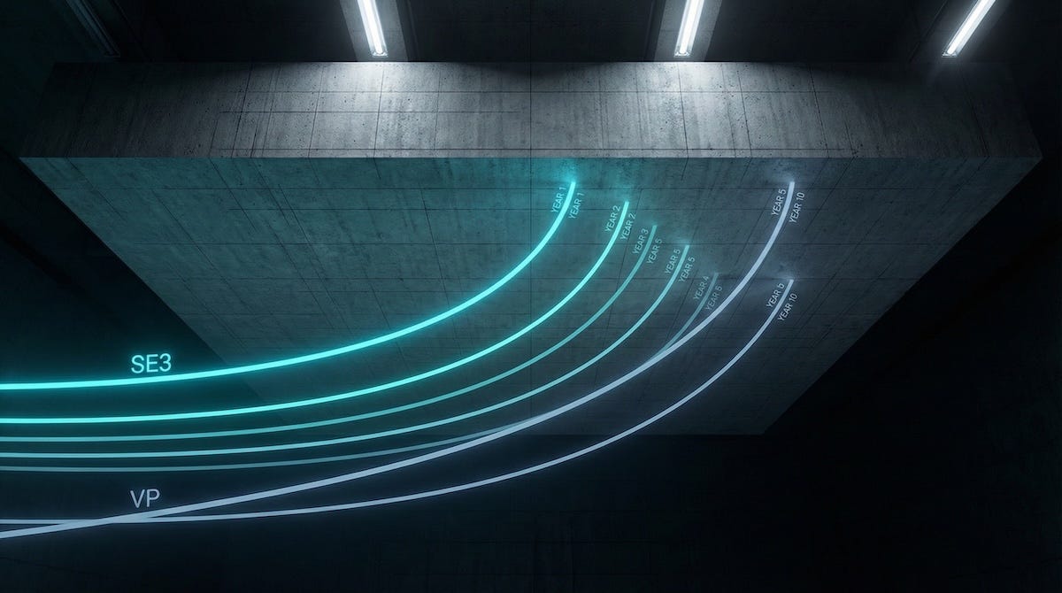 The framework defines capability at each level; the specific behaviors, impact, and domains expected of an SE2 versus an SE3 versus an SE4. Band Compression defines the planning horizon, the timeframe within which the organization should expect to have a conversation about trajectory at each level, encoded not as managerial opinion but as compensation physics. The framework says what growth looks like. Band Compression says when the conversation about growth needs to happen. Together, they form a single architecture, one that makes both the destination and the timeline visible.